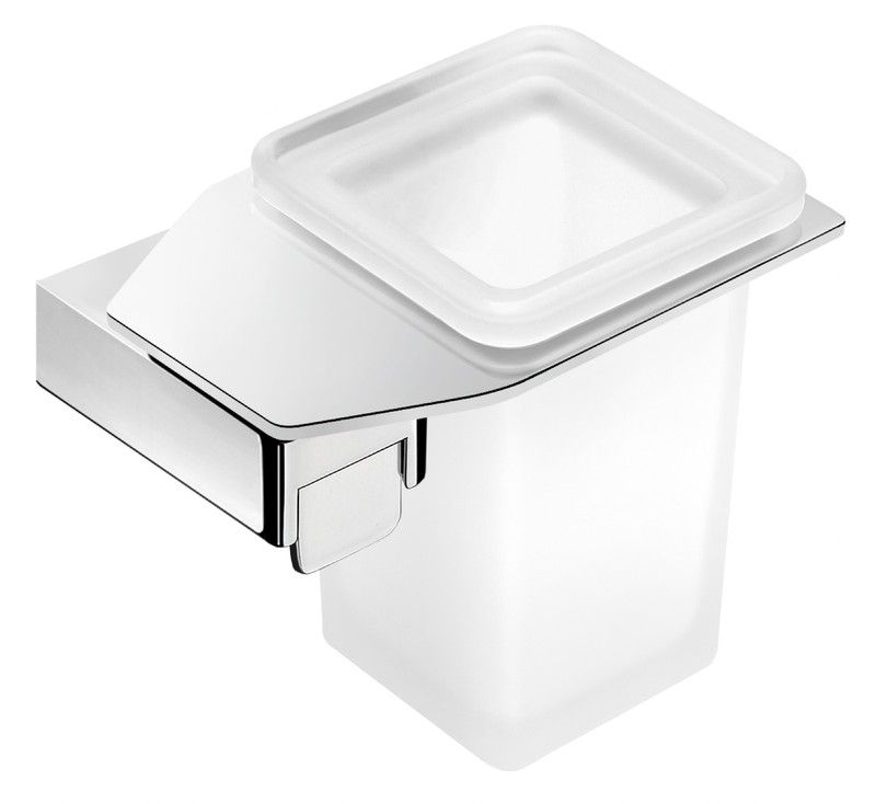 Bekerhouder voor tandenborstel of tandpasta die de chromen afwerking combineert met gehard glas