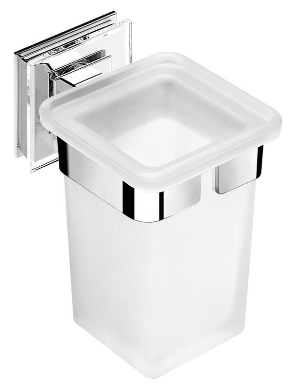 Bekerhouder voor tandenborstel of tandpasta die de chromen afwerking combineert met gehard glas